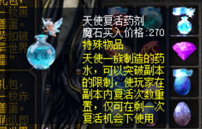 天使复活药剂:可以突破副本的限制,使玩家在副本内复活次数重置,副本可复活5次,仅可在复活4次时使用。